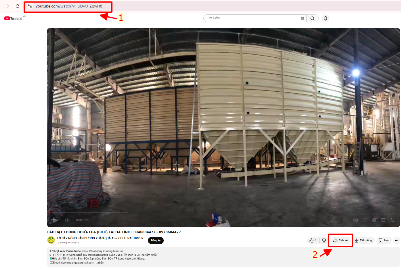 Bước 1: Anh/chị mở “1.link video” đã đăng trên youtube, sau đó chọn “2.Chia sẻ” và ở dưới video và chọn “Nhúng”