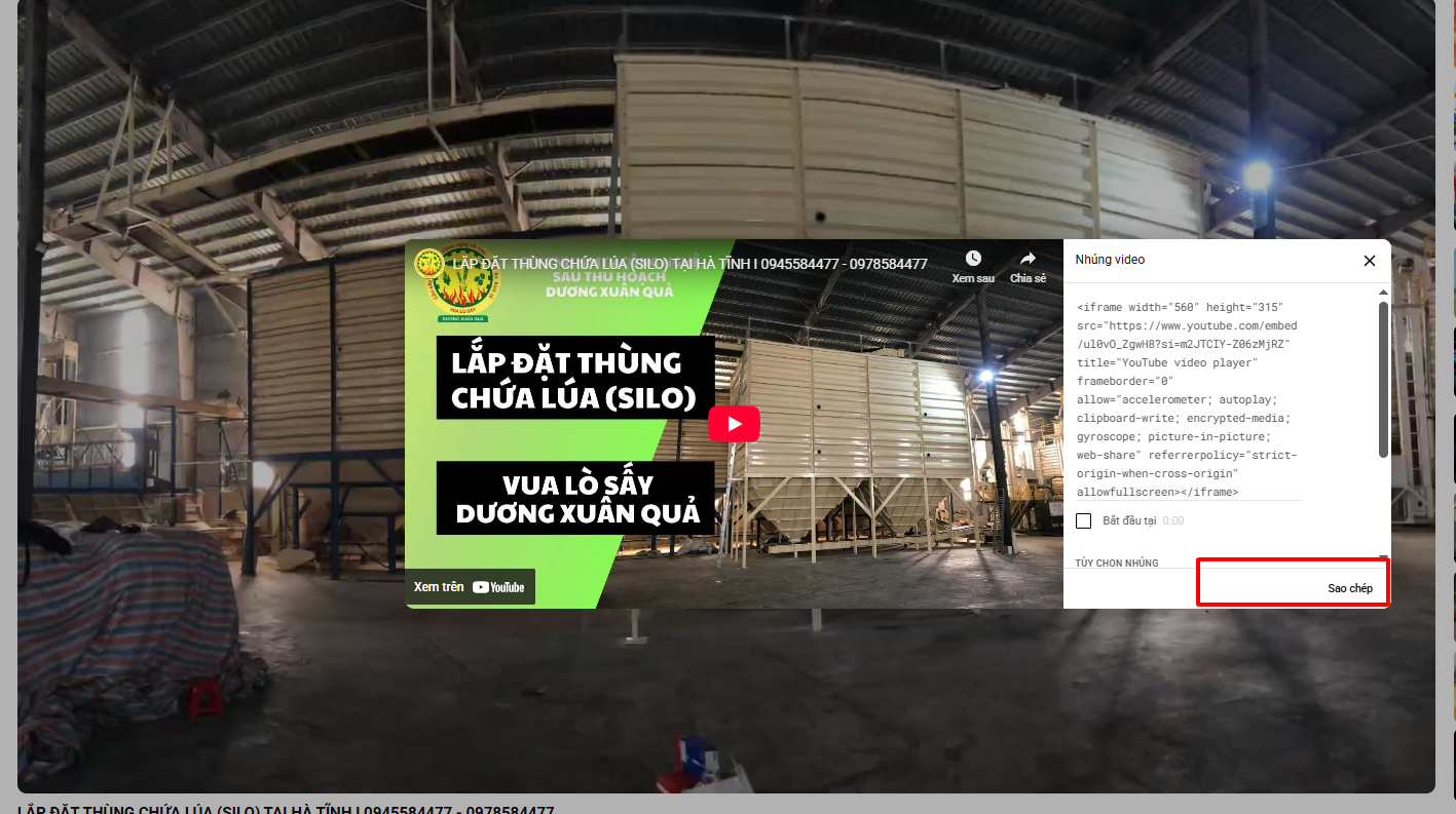 Bước 2: Sau khi chọn ‘Nhúng” sẽ hiển thị ra mã code của video, chọn “Sao chép”