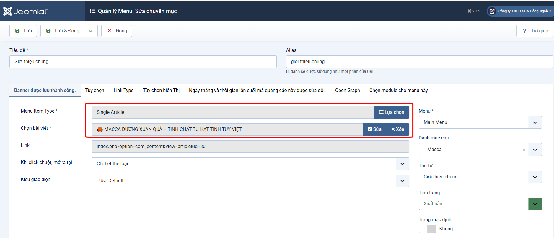 Trường hợp 2 (hình 10, 11): Khi anh/chị chọn “Menu Item Type” là “Single Article” có chức năng là hiển thị một bài viết duy nhất, khi chọn vào chức năng này thì sẽ không tạo được danh mục liên kết và sẽ chỉ hiển thị một bài viết duy nhất. Ví dụ khi chọn “Single Article” (hình 11) thì khi nhấn vào chọn tiêu đề “Giới thiệu chung” (hình 21) sẽ chỉ hiển thị một bài viết duy nhất liên kết với danh mục con này.