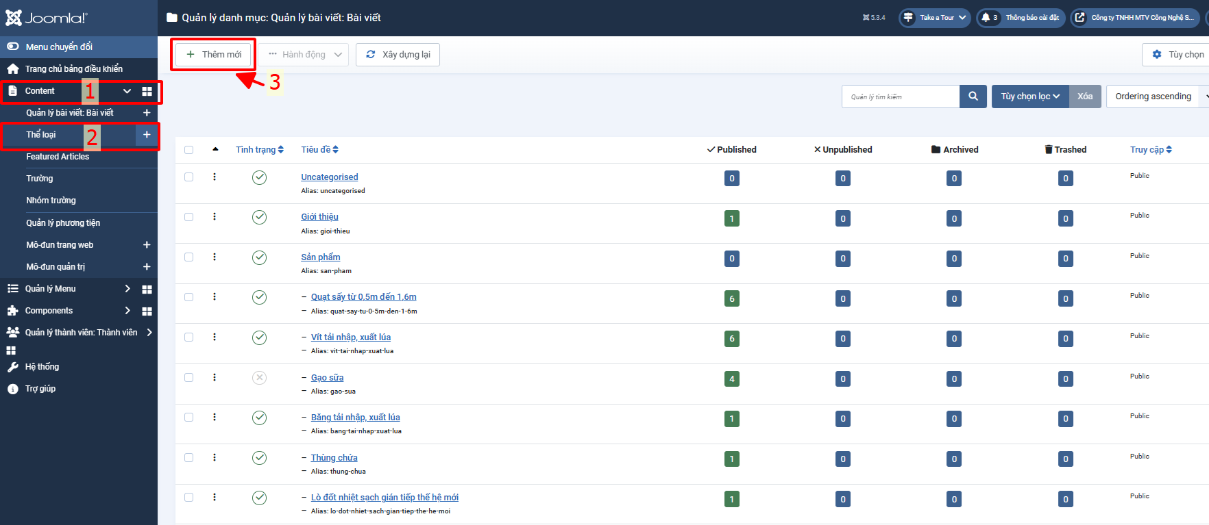 - Số 4: Chọn một thể loại đã tạo trước đó. Theo ví dụ đã tạo thể loại “sản phẩm” trước đó nên anh/chị nhấn chọn tên thể loại đó.
