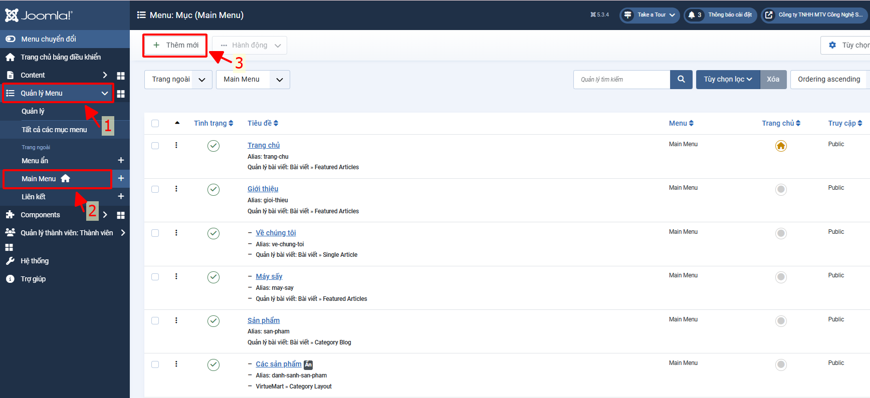 Bước 3: Sau khi lưu thể loại thành công, anh/chị tiếp tục tạo menu chính cho “sản phẩm”. Vì “Sản phẩm” thuộc menu chính (Main Menu). Trình tự thực hiện theo các bước sau: “1.Quản lý menu” à “2.Main menu” à “3.Thêm mới” để vào giao diện thêm mới menu.