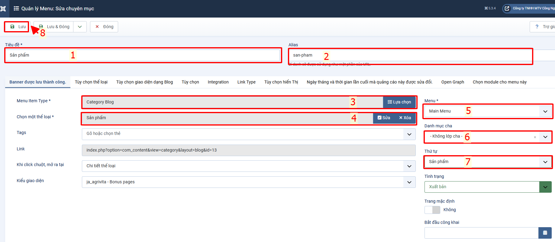 - Số 8: Sau khi thực hiện các thao tác trên, anh/chị chọn “Lưu” để hoàn tất thêm menu chính.