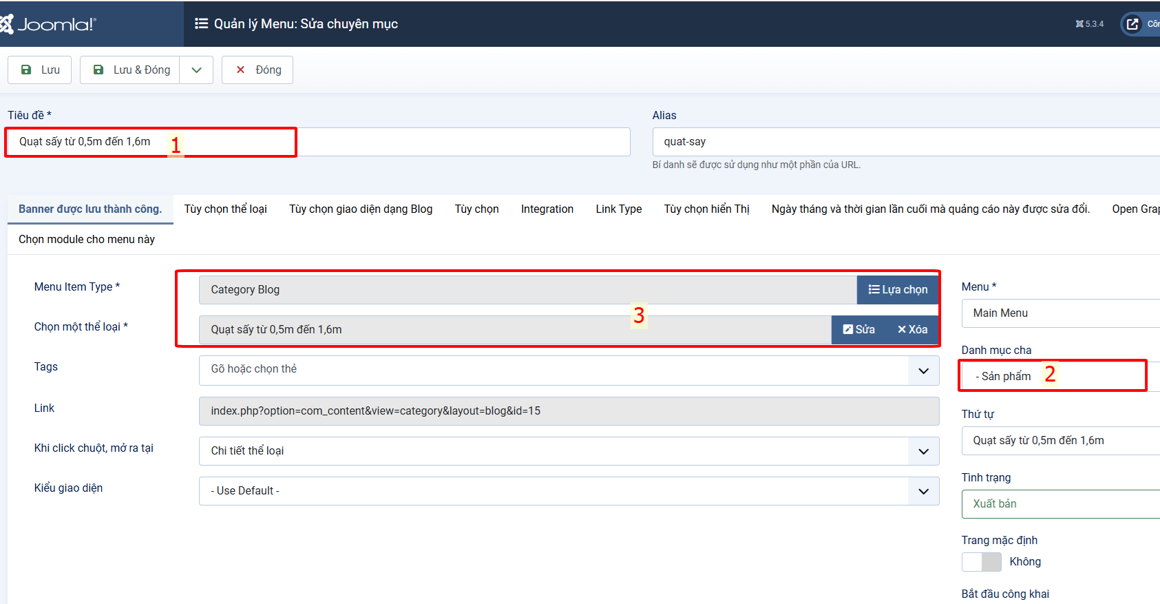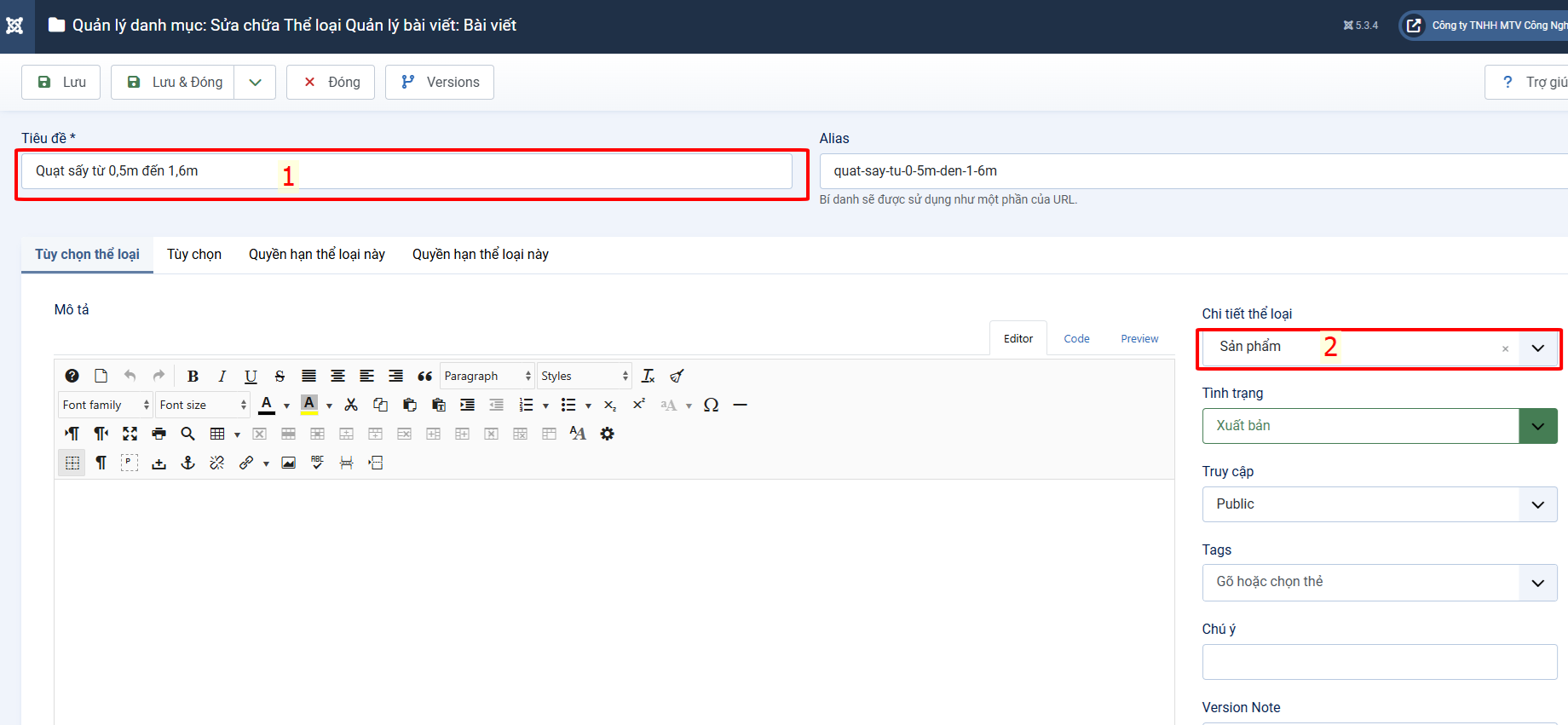 - Số 2: “Chi tiết thể loại” chọn danh mục cha. Theo ví dụ sẽ chọn danh mục cha là “sản phẩm”, vì “Quạt sấy từ 0,5m đến 1,6m” là danh mục con nằm trong danh mục cha “sản phẩm”