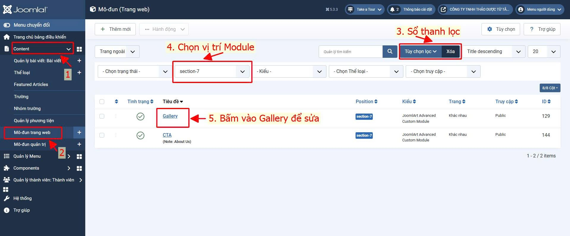 Bước 5: Vào mục menu “Content” → “Mô-đun trang web”. Chọn “Tuỳ chọn lọc” và tìm kiếm theo vị trí Module “section-7”. Tìm module tên “Gallery” rồi bấm vào tiêu đề để vào sửa module.