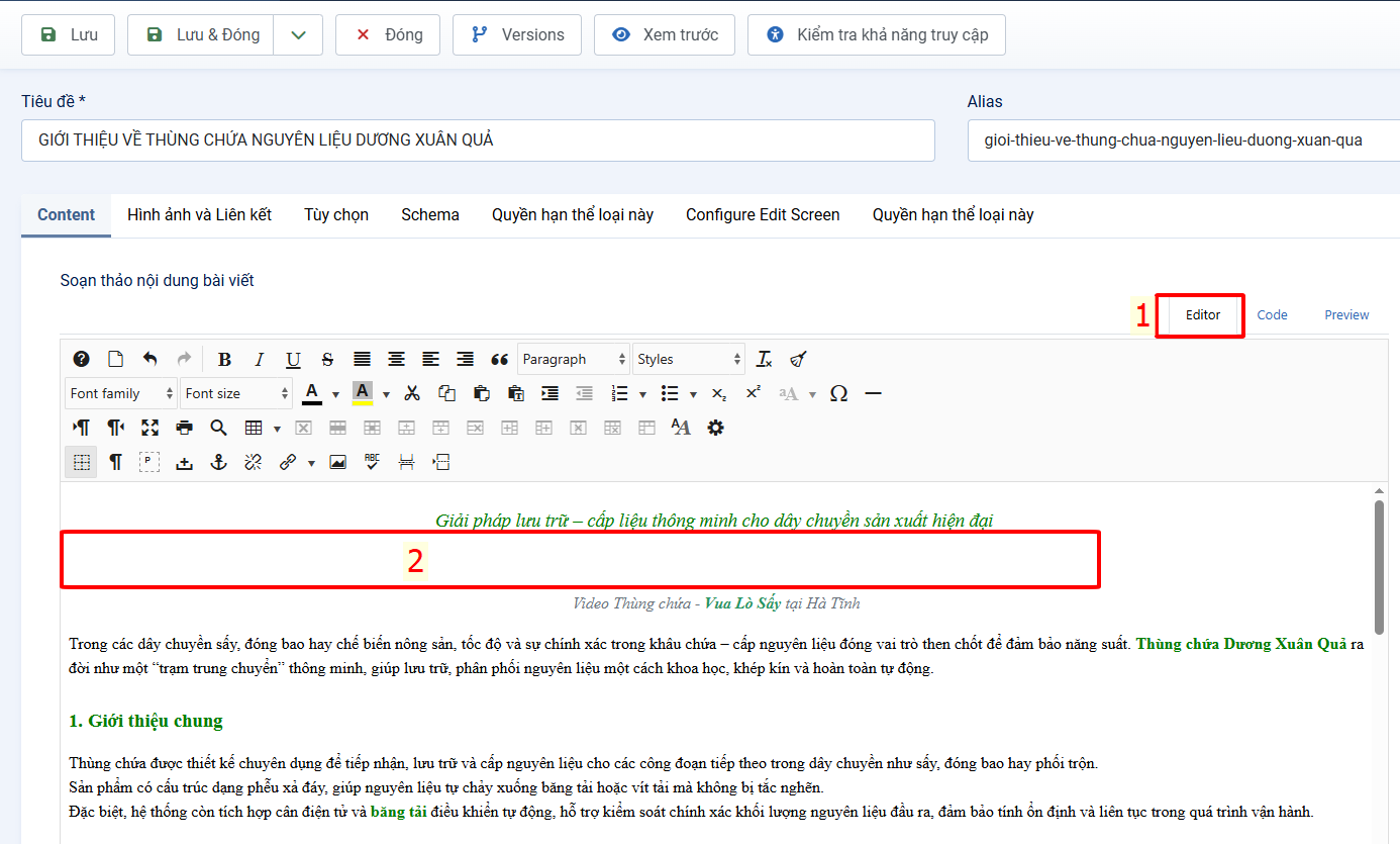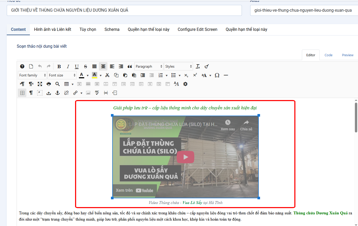 Bước 5: Sau khi chèn mã code của video anh/chị chọn lại ô “Editor” nội dung của bài viết sẽ hiển thị video đã chèn vào. Nhấn “Lưu” để hoàn tất thêm/sửa video.